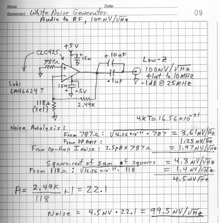 This noise generator amplifies the noise from a resistor using a fast op-amp to provide a very predictable and flat noise spectrum from audio up to about 25 MHz. This older design uses an obsolete CLC425 but newer op-amps will work well. The noise calculations are included so that the experimenter may perform the calculation for newer amps.