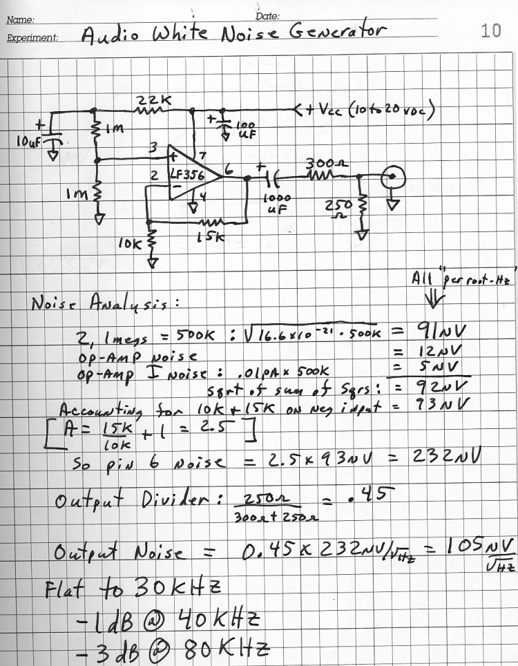 This handy noise generator produces white noise from well below 1 Hz to over 40 kHz by amplifying the noise from two resistors. Use good quality metal film resistors for consistent results. This design uses an older LF356 JFET op-amp and many others will work. See the noise calculations to determine if another op-amp is suitable. The best choice of op-amp will be an FET type.