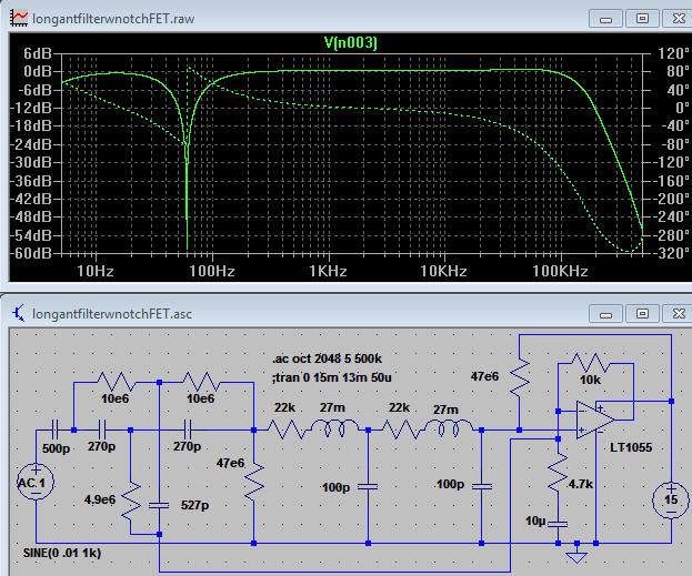 Here's an op-amp version. The op amp can be any number of FET input types, especially JFET types which have fairly rugged input stages. (I like the LF356 here.) Note the unusual feedback to the bottom of the twin-T filter. That voltage bootstraps the bottom of the T, reducing the loading effect of the 4.9 megohm resistor. The 4.9 meghom resistor could be a 4.7 meghom in series with a 150k and a 100k pot and the 527 pF capacitor could be a 470 pF in parallel with a 47 pF and a 20 pF trimmer. Those variables would allow the notch to be fine-tuned, if desired. The 27 mH chokes are molded types - nothing special. This circuit is best for longer cable setups. Note the 500 pF at the input; that represents a fairly long coaxial cable to the antenna. Such a long cable significantly attenuates the signal but the RLC filter is much lower noise (about 25 nV/root-Hz) than the typical 1 megohm resistor (about 125 nV/root-Hz) often used at the front-end of such receivers. The result is that the atmospheric noise is well above the electronics noise for reasonably good op-amps by about the same amount as traditional receivers with direct connection to the antenna (with that 1 megohm in series). Note the nice, flat response out to 100 kHz followed by a steep drop thanks to the RLC filter. RC filters are adequate and eliminate the need for the inductors (see the next schematic).