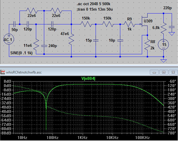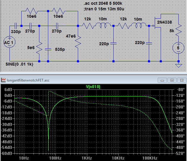 The original circuit is shown below for "historical purposes." Use a 2N4338, J201 or similar low pinch-off JFET. The notch filter isn't bootstrapped so the very high-value resistors and small capacitors are an attempt to load on the antenna as lightly as possible. The circuit does invert the signal which is better for stability. Another distinct advantage is that the power is completely supplied by the computer when that jack is used. The high-value resistors were formed by selecting 22 megohms to connect in series to get an accurate value.