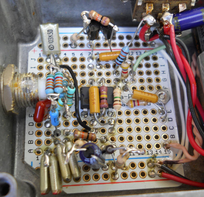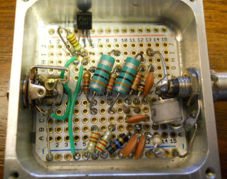 I've discovered that one's hobby time can go a lot further if one isn't too concerned with internal neatness! As long as the construction is rugged and reliable it will do! The Adafruit prototyping boards allow for amazingly quick prototyping and great density if one is willing to move into the third dimension. Notice how many of the parts are wired up in the air. The two-transistor power switch only uses one dedicated board trace plus power and ground; all the rest is wired in the air or goes to traces already used. The notch filter is similarly air-wired. The board gives the whole structure plenty of mechanical integrity. There's a thin sheet of epoxy-fiberglass board under the circuit board to prevent component leads from touching the case. That allows construction from the top side - every component on that board was soldered in after the board was mounted in the case, thanks to the high-quality plated holes. Despite all the parts, there's still ten or eleven traces available. : )