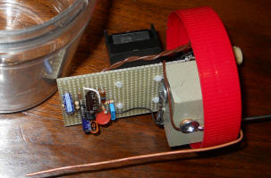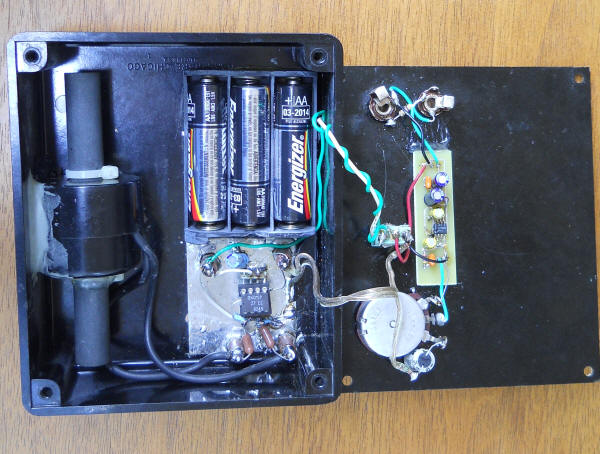 The ground wire is a 9" length of 14 AWG solid copper wire like that used in house wiring and it is simply bent down along the jar so that it makes good contact with the hand while the unit is in use. (The body serves as the ground for the receiver - don't forget to grab the wire.) A volume control and output audio jack are also mounted in the lid. The block of wood also serves to support the circuit board and battery holder.