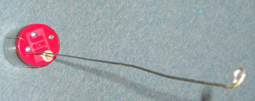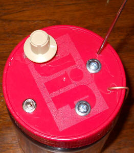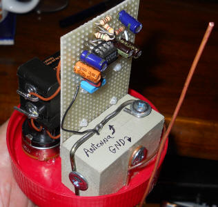 This simple receiver is built into a plastic peanut butter jar and uses a straightened coat hanger for the antenna yielding a length near 32 inches. A block of wood attached to the lid by two screws stiffens the lid and supports the antenna and ground wire. Two additional screws secure the antenna and one screw holds the ground wire. The enamel was sanded off a a section of the coat hanger wire to allow the attachment of a short length of hookup wire: