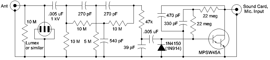 Note: you may get better results with a "video isolation transformer" between an amplifier like this and your computer as described above. The problem is that this circuit gets its power from the computer, so connect the transformer as a common-mode choke, with the primary connecting between the amp output and sound card input and the secondary connecting between the two grounds. Don't be surprised if it just makes things worse; the phasing might be wrong. Try reversing one of the windings, in case the phasing is incorrect. It's important to have a good ground for the antenna, preferably a buried metal water pipe or something similar. It's okay to run a long wire over to the ground for reception purposes, it's just audio, but a straight, heavy wire to ground also helps protect from lightning damage. A commercial surge arrestor like those used for satellite TV systems is a good idea. Search for "coaxial surge protector" on Amazon for an example; they're as little as $4 and contain a beefy gas discharge device. Try to run a heavy wire straight to a good ground from the protector's body; some even have a screw for the wire.