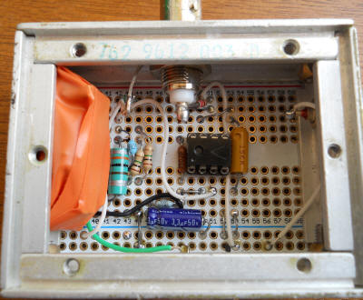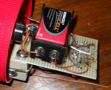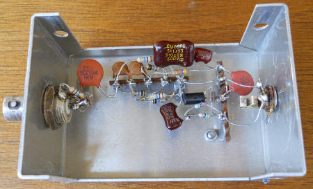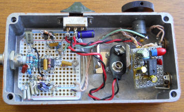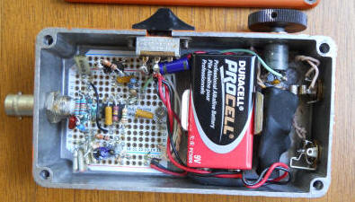 I painted my tin with gray hammertone paint and affixed a label to the lid. The circuit is built on a piece of polished copper clad circuit board sprayed with a light coat of clear Krylon to keep it shiny. All the ground connections are made directly to the copper and a couple of terminal strips hold most of the components. A battery compartment is formed with two pieces of copper clad board soldered in place as walls and a piece of foam rubber on the lid secures the battery. Just about any assembly technique should work fine so don't feel compelled to copy this approach.