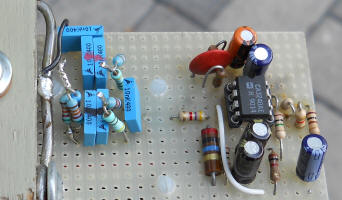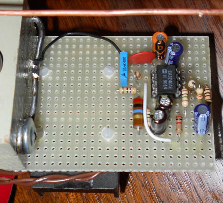 I built the notch filter on a little board and "potted" it in orange electrical tape. It becomes a three-legged part and takes up little board space. The op-amp is the venerable LF356. (The LTSpice circuit uses a similar part that was in the component library.) The gain is fairly low, just high enough to get the signal out of the noise as this circuit will be driving an AGC amplifier.
