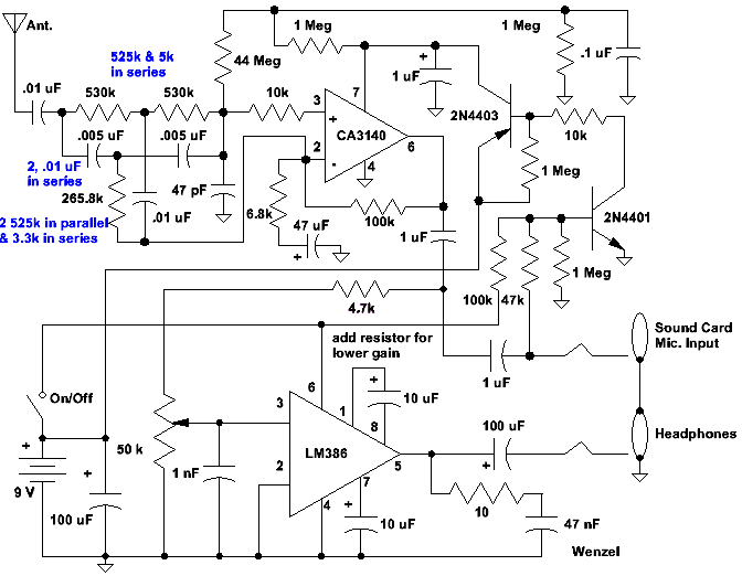 The gain of this circuit is very high and may be reduced by reducing the 100k feedback resistor connected to pin 6 of the CA3140 or by adding a resistor in series with pin 1 on the LM386 (or doing both). When using an outdoor antenna, add a surge suppressor box with a high-value bleed resistor to ground. Add a DC power option for long-term use with a computer. A power jack could be wired to apply power to pin 7 of the CA3140 while disconnecting the 2N4403 collector (using a power jack with a built-in changeover switch).