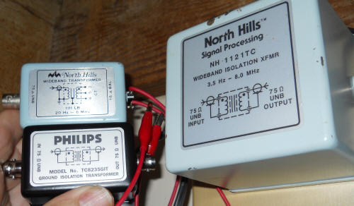 Fixed installations can benefit greatly from an isolation transformer between the receiver and the computer. "Video isolation" transformers are readily available, my favorites being a North Hills 1111LB and the much larger and wider band 1121TC. I also have a Philips TC8235GIT that works well and there are plenty of other types and models. The idea is to break the ground connection between the antenna circuit and the computer, and also the house wiring when practical. Here are two traditional video isolation transformers held next to the huge 1121TC that is my "permanent" isolator. The small North Hills has a couple of clip leads on the secondary terminals (instead of a BNC) and that's handy for experimentation with grounds and antennas. These transformers have an extremely wide specified bandwidth, 3.5 Hz to 8 MHz in the case of the 1121TC, but that's when driven by and terminated with 75 ohms. So it is best to use an amplifier with a fairly low output resistance to drive the transformer and use a 75 ohm termination at the sound card. The values aren't critical for audio work.