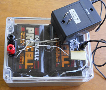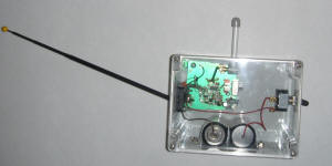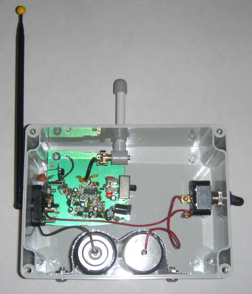 That's the completed unit with the cover installed. It should be quite weather resistant and the batteries will last for several days of continuous operation. This battery-powered receiver can be placed quite a distance from the house and overhead wires yielding some of the cleanest reception I've heard. I might add provisions for a ground wire to clip to a metal rod, car chassis, etc. The impedance of the amplifier is so high that a pretty terrible ground connection is adequate. I've had great luck with an old steel rotisserie skewer connected with a length of hookup wire. Just stick it in the ground - even dry soil seems to do the trick.