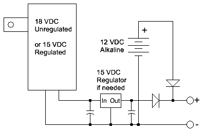 Building all the circuitry to run on a single +12 to +15 volt supply simplifies the power supply and makes battery backup easy. Battery backup is highly recommended since listening is often most interesting after a power outage! Find a small but linear power adapter that is rated at 18 or more volts and build a regulator to supply the +15volts. Alternately, you might be lucky enough to find one that includes a linear regulator. Battery backup can be quite simple; just pass the regulated voltage through a Schottky rectifier to the load and connect a 12 volt lantern battery through another such rectifier to the load. When the line power is good, the load gets 15 volts minus a few hundred millivolts and the battery rectifier is reverse-biased. (I actually used an adjustable regulator set to 13 volts.) When the power fails, the battery supplies 12 volts minus a diode drop and the other rectifier prevents current from flowing into the regulator. Current draw will be low so the batteries should last through decades of power outages.