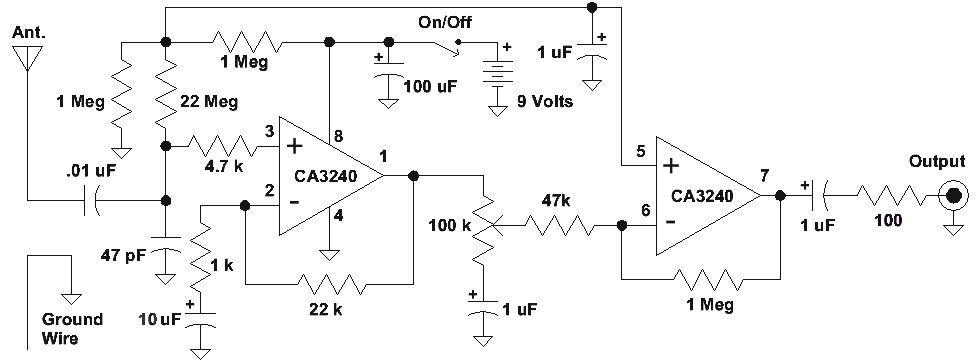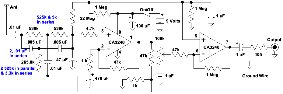 |  | The 100 megohm bias resistor may be several 22 megohm resistors in series and the value is not critical. A higher value (or longer antenna) will give better low frequency response but that only invites line frequency troubles. Stand reasonably still when listening or changing electrostatic fields will overload the amplifier, especially if you are wearing rubber sole shoes. |