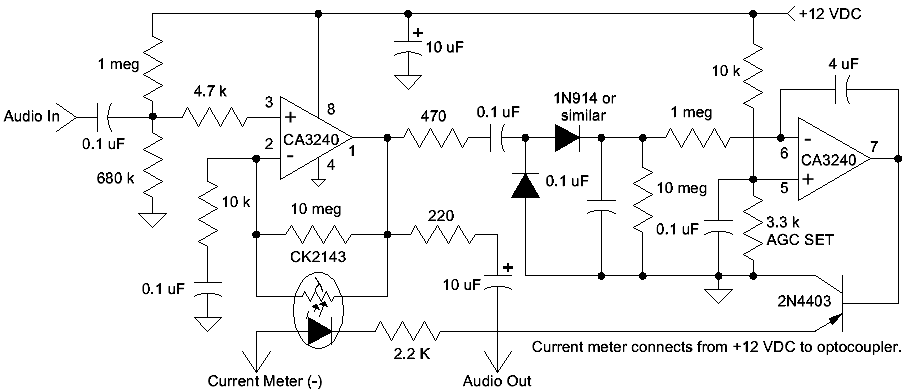 The AGC amplifier below is shown using a Raytheon CK2143 CdS-based optoisolator but others will work as will a homemade one made by gluing a CdS cell to the end of an LED (see the AGC Dynamic Microphone). A 1 mA current meter connects from +12 VDC to the cathode of the optoisolator's LED to indicate the ACG activity. (Ask me about where to find the CK2143.)