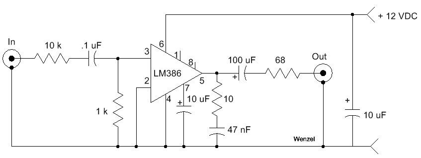 A simple LM386 amplifier with an input attenuator and a 68 ohm output resistor will exhibit about a gain of two into a 75 ohm load, such as a video isolation transformer. In my setup the final gain was too high for driving the line input of a sound card so I increased the 10k to about 22k. After loading the far end of the audio coaxial cable with 75 ohms, the levels were just right. If you choose to skip the AGC amplifier above, you can pick up a little gain right here by lowering the 10k or even shorting it for a full 20 dB gain. The bandwidth is around 300 kHz, plenty for monitoring SIDS or LowFER beacon transmitters.