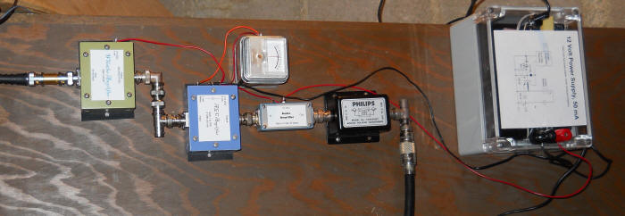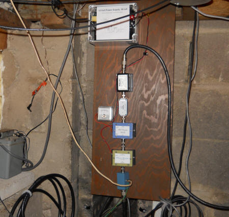 When this is all working to my satisfaction, I'll hang the board on a wall where the antenna enters my basement. The modules are easy to work on but I find it even better to take the whole thing over to the bench so I'll make the hangers easy to release. There's a Tee on the input to the AGC amplifier in the event I want to use the preamplifier's output for higher frequency reception. I'll move that to the antenna since the Whistler Amplifier doesn't load the antenna at all. A future RF amplifier for LF signals would also need a very high input impedance. The current meter is at 1/2 scale with lightning in the area and that corresponds to a gain around 50. I therefore have 34 dB of AGC headroom.