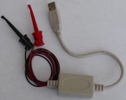 A PicAXE measures the voltage on an analog input pin and sends 10 bit data to Amaseis for plotting. I decided to dedicate a $6 USB to serial adapter to the job and when I opened the case I discovered enough room for the PicAXE and the few needed resistors. There's 5 volts in there, too. Originally I planned to take out the board and move it to my own larger case. The red and black test leads come out the hole previously used by the DB-9 serial connector.