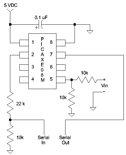 I used a voltage divider on the input giving the device about 10 volts full-scale range (mine tops out at about 9.5 volts). These resistors also protect the PicAXE from damage to some degree. Feel free to add an op-amp buffer here; I'm shooting for simplicity. Here's the simple program for the PicAXE: