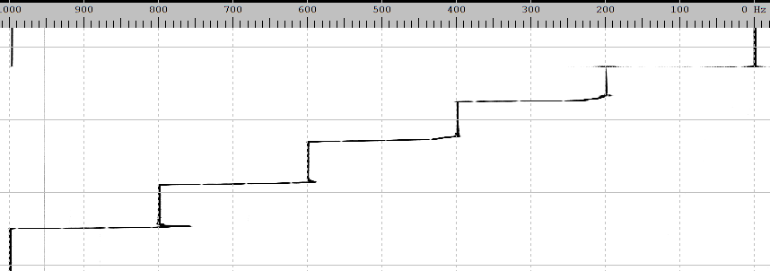 I made those steps by hand with a 10-turn pot hence the squiggles at the edges. By instructing Spectrum Lab to subtract 1 kHz from the spectrum display the frequency in Hz corresponds to millivolts. The converter is accurate beyond the ability to resolve on the screen even when it's full-size. The V/F was on a bench across the room and held down by a heavy battery (just for the mass):