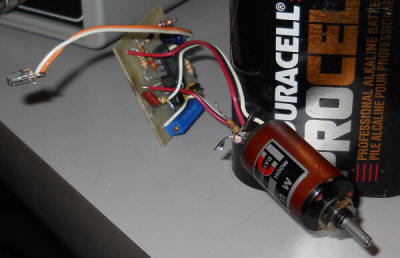 The V/F is the little board with the blue gain pot. The big pot is the "position" or zero offset control. I don't have the resistors in each end of the position pot so it's a bit sensitive. The IR LED is pointing at my desk where the photo transistor resides.