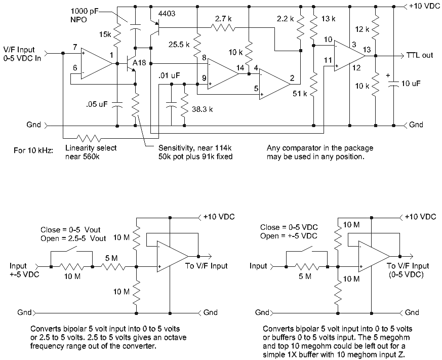 Here's my original circuit that shows a few optional front-ends. This version produces 0 to 10 kHz with surprisingly good performance at very low frequency. When using an FFT program it's best to restrict the frequency range to a single octave to avoid harmonics appearing on the plot. So I'd offset the input to have a minimum frequency that is 1/2 full-scale, as is done with the open switch in the optional input circuit schematic to the left.