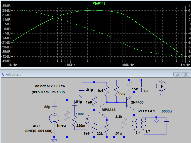 Note: If you wish to monitor more than one transmitter at a time, you can modify the indoor unit to provide a flat response from about 10 kHz to over 60 kHz by replacing the Pulse B2136 with an audio telecom transformer. Here's the new circuit and simulated response of the whole circuit: