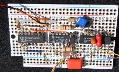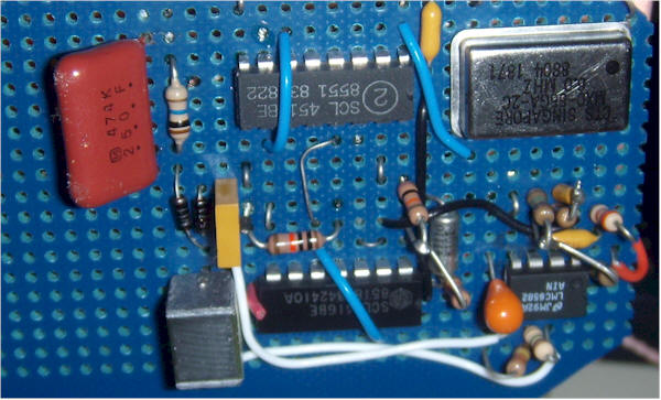 It's amazing how much circuitry one can get on an Adafruit prototyping board if one is willing to put parts everywhere! Note the oscillator was graded to be 1.4 Hz high at 60 kHz; a little frequency error is necessary.
