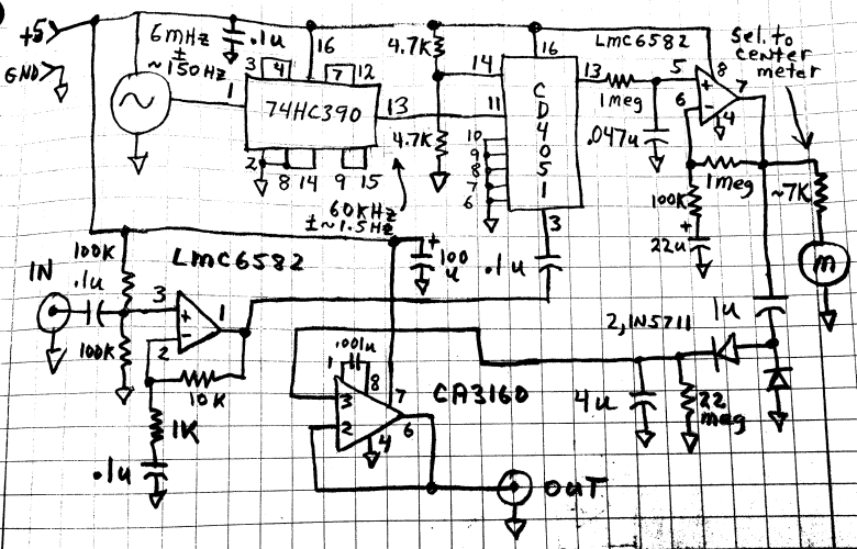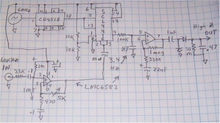 The 6 MHz oscillator is intentionally chosen to be a little off frequency, about 100 to 200 Hz. It is divided down to 60 kHz (off about 1 to 2 Hz) and used to chop the received 60 kHz with an analog switch. Since the oscillator is slightly off frequency, the converted 60 kHz signal comes out at about 1 or 2 Hz. This low frequency signal passes through a 3 Hz low-pass filter and is rectified. The effective bandwidth is quite low and the signal just peaks up above the noise. The receiver is fed by the antenna and amplifier at the top of this page.
