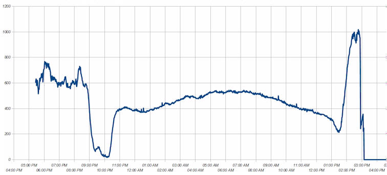 About 10:30 PM (6/14/2010) to 5:30 PM (6/15/2010). The graph clips at 1 volt, the full-scale input of the data taker.