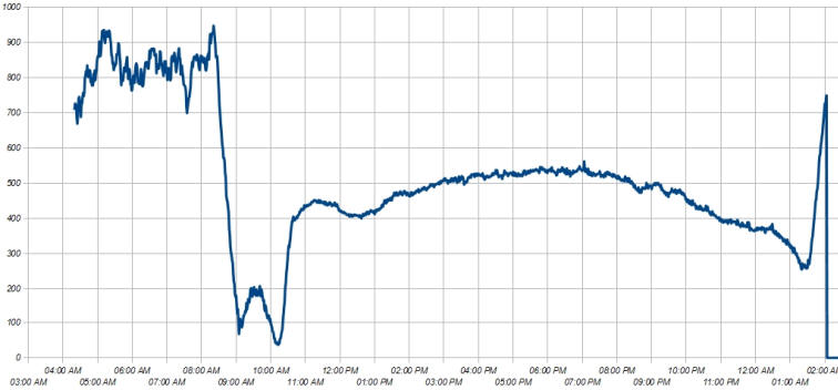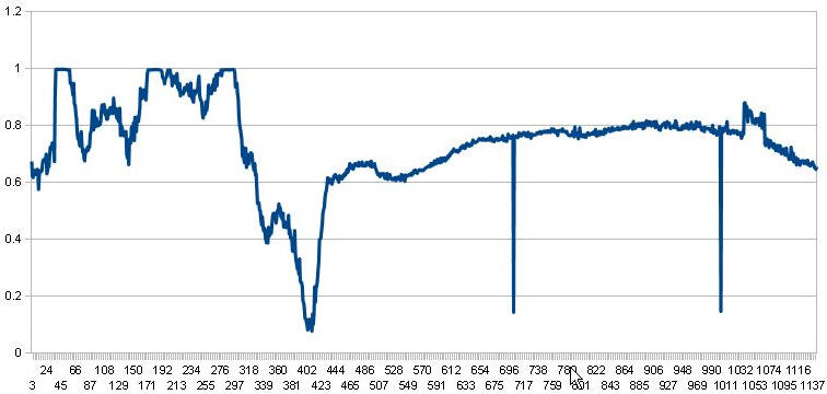 This plot shows the signal just clipping at night, a dip at sunrise, a "rolling hill" that is typical of signal strength during the day, and a little burst of something near the end of the day. Not bad for a first try. It turns out that this very old laptop is not quite up to the job. It gets "busy" now and then for no apparent reason and misses entries. Those two drop-outs are actually the computer ignoring some of the bits of a couple of measurements.