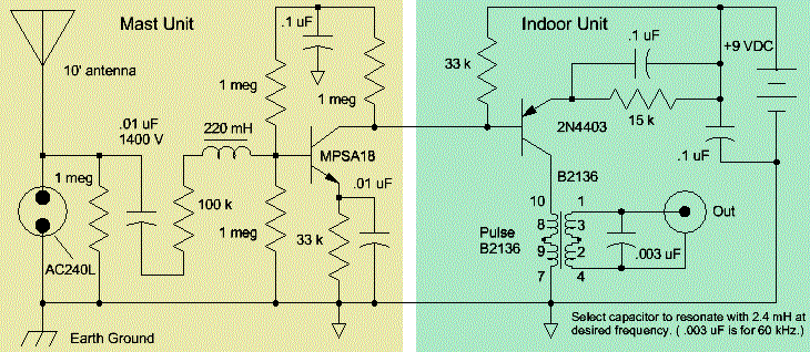 A surge suppressor, bleed resistor and single transistor stage are located in the antenna box. The antenna is connected to a Littlefuse surge arrestor but any similar device should be fine, perhaps just a neon bulb. The 1 megohm resistor slowly discharges the antenna. The antenna is coupled to the transistor amplifier with a high-voltage disk capacitor. (All those efforts are attempts to protect the transistor from nearby lightning strikes and static build-up on the antenna.)