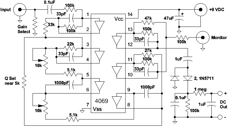 The output of the filter at pin 8 feeds two more amplifiers made from the last two gates. There's plenty of gain for most situations, but the gain may be adjusted up or down by varying the input resistors to the amps. Eventually, you will want the rectified output voltage to be about 1 volt maximum at nighttime when the signal peaks. The output of the last stage (pin 12) drives a simple diode detector and low-pass filter. The output has a 1 megohm resistor in series, so it's only good for driving a DMM or other high impedance load. The monitor output was added as an afterthought to allow for listening to the signal with a crystal earphone and for observing the amplified audio output on an oscilloscope. It's nice to be able to see and hear the actual signal when preparing a receiver.