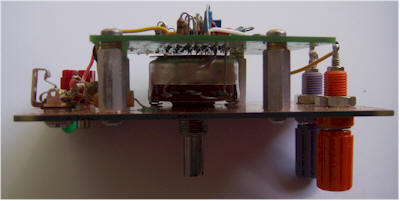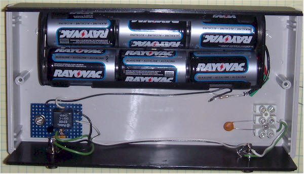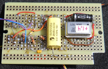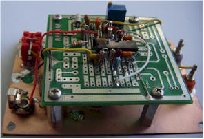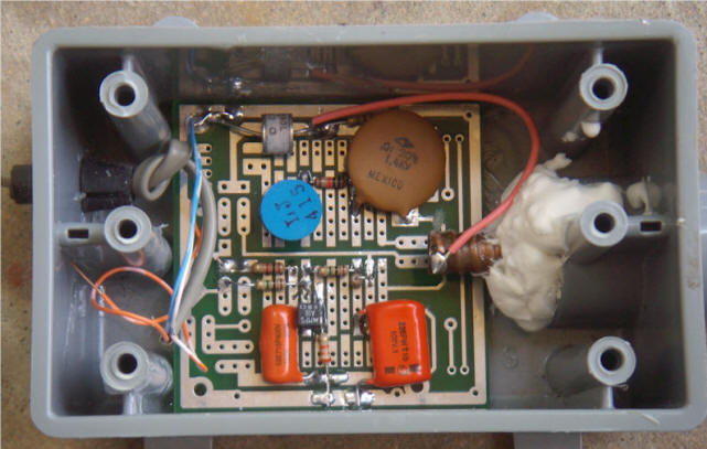 The PNP transistor amplifier and output transformer are mounted on a piece of perfboard near the input connector and the resonating capacitor for the transformer is located near the output connector. A screw terminal block allows for easy changing of the resonating capacitor. You might want to make the capacitor a front panel plug-in or switch selectable value. I've come to the conclusion that I'll leave the thing on one frequency for months at a time.