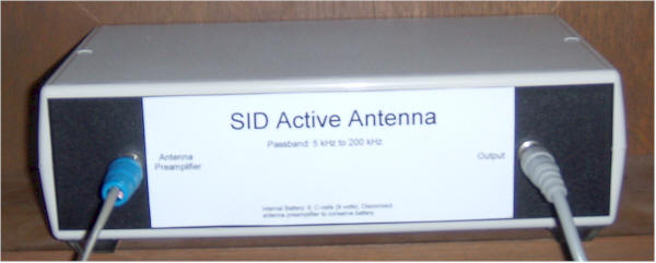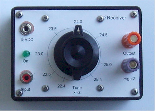 No power switch is included, but the battery does have a fuse in series, in case something gets shorted. The power consumption is low enough to ignore, but the current can be completely shut off by unplugging the input. Different experiments will plug into this antenna unit and the gain will be lowered to the desired value simply by adding a shunt resistor across the input connector of the particular experiment. For example, the 24 kHz SID receiver below had far too much gain, so a 470 ohms was connected across the 24 kHz receiver's input connector. A gain resistor or potentiometer (5 or 10k) could be connected in parallel with the resonating capacitor in the indoor unit. Perhaps the gain resistor should be soldered to the resonating capacitor since that cap is selected for the particular signal of interest.