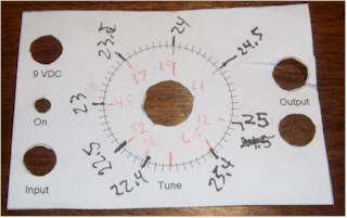 I used a cad program to make the label but I started with a dial with lots of lines, pasted on a temporary label, and marked the exact position of the dial for the different frequencies. I then used those marks to locate the lines for the final label.