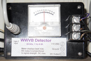When you connect the antenna and tune the receiver to a signal, a DC voltage will appear at the output, if all is well. The signal will get stronger at night so it might take a few nights to find the best gain select resistor to keep the output below 1 or 2 volts. (The Keyboard Wedgie data recorder is limited to 1 volt.) I found it convenient to shorten the antenna to drop a little gain, too. My antenna is in two foot sections and I ended up using only 8 feet and a fairly low gain set resistor of 470 ohms. There's a pretty strong signal here in Austin.
