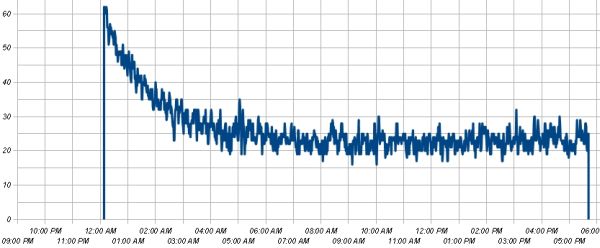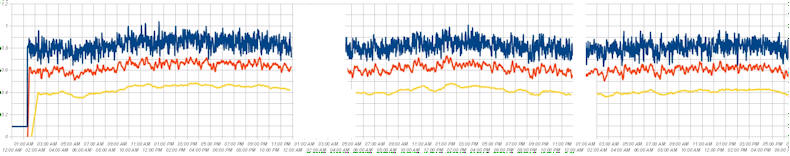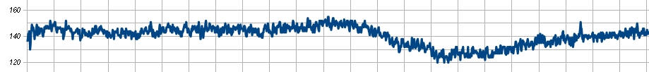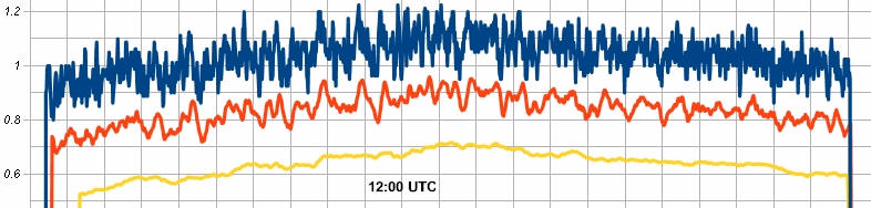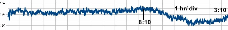 Here's the rest of the day (below). The chart is politely returning to the nominal reading just above 140. This chart has a large offset and 5 counts is equal to 0.1% of the full-scale span. The apparent effect is about 20 counts or 0.4%. I thought something was wrong, so I spent a lot of time checking local parameters like barometric pressure and temperature, but nothing looked like this chart.