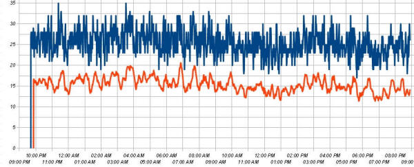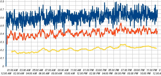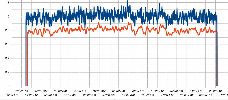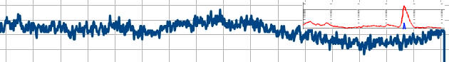 Now we're cooking. This is the plot so far today (10/25/2010). The vertical scale is calibrated in percent of full-scale. The short-term variations in the red, 10 minute moving average trace are too quick to have been induced by temperature, pressure or humidity. I think I can see a slight bump up at about 2:00 AM, then a hop back down around 1:00 PM of about 0.03%.The transitions seem to be preceded by noise. It might just be system noise, but this is enough resolution to be interesting. This is a nice, long plot that is fairly straight; 0.3% would be huge on this scale. OK, nature; surprise me.