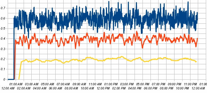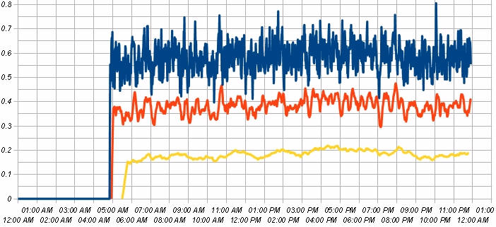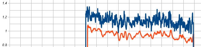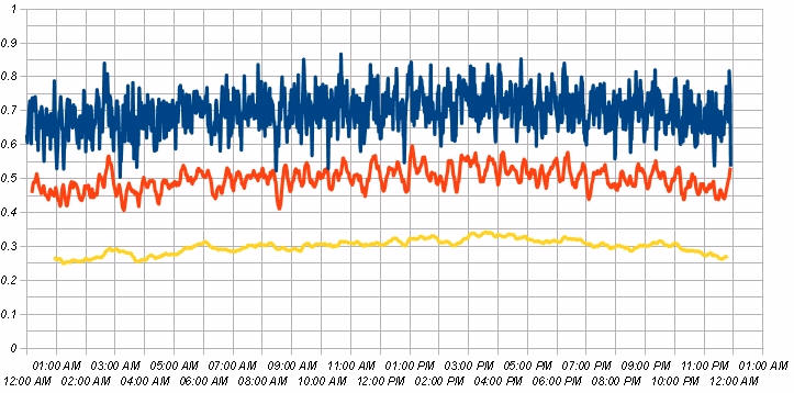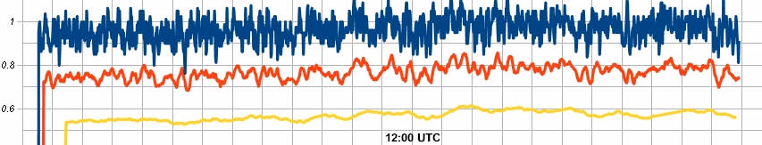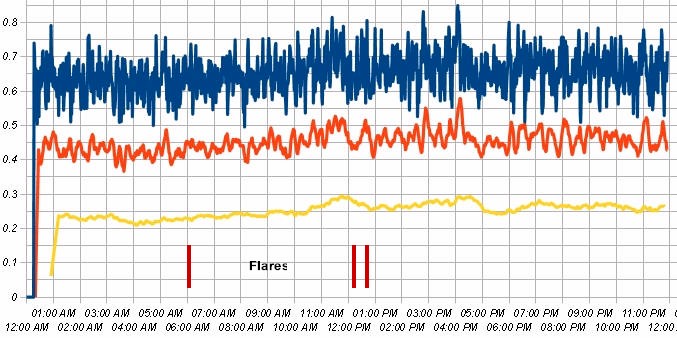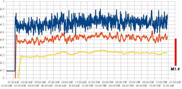 Granted, there are some dead spots that I covered with white to avoid confusion (the averages dip when there's no data), but there just isn't any sign of a significant dip. Keep in mind that the reported effect for X class flares would be on the order of six divisions, pushing the yellow trace off the bottom of the chart. All I see is the regular wander I've been getting all along. The last section is about 16 hours of data, one of the smoother curves I've seen, then there's an hour gap (more gap for the running averages, simply because they're averages). The effect couldn't be hiding in that one hour gap. It just isn't happening, at least at the M class level. Not even Al Gore could predict M class flares with this data!