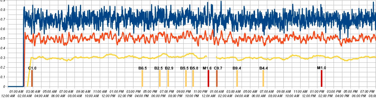 I'll continue the plots in case the event has to reach into the class-X range to be seen. We are talking orders of magnitude, so it's possible these flares are simply too small.