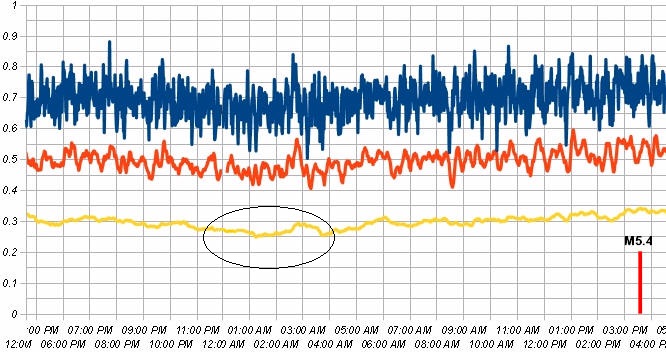 The plot ends at 19:00 UTC and the divisions are one hour. Note the bump that peaks at about 11:00 UTC, followed by the decline that drops a full division below the average, or about 0.2% of full-scale. The flare occurred about seven hours after the peak, very much like the six hour delay below. The plot below shows a larger deflection and the flare was much bigger.