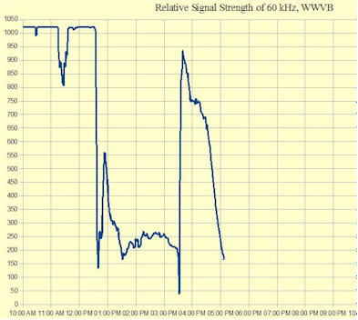 The early and late portions of the above chart are at night when there is a large sky wave signal; they're interesting, but should be ignored for this experiment. The "pertinent" stuff is between about 1:00 PM and 12:00 PM UTC. A little after 7:00 PM, UTC, the solar flare quickly ionized the lower ionosphere and the reflected signal from WWVB jumped up, right off the chart. Then, the ionosphere's reflectivity returned to daylight normal in an exponential fashion.