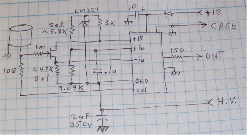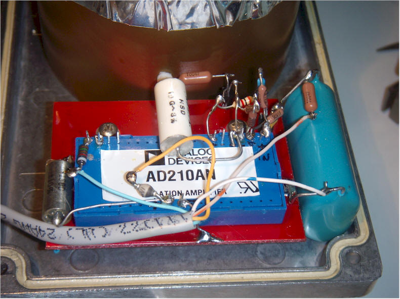 The preamplifier floats and is biased with an external supply. That allows the chamber to be grounded relative to the outside world. The FET was biased to its zero temp-co point by selecting the source resistor and the zero was set by selecting a voltage divider for the output amp. The resulting temp-co should be well under 10 uV/C at the operating temperature. The temp-co is bowl-shaped and changes about 200 uV from 25C to 35C, with the flat portion at about 30C, where the chamber will be set. (The poorly labeled box in the schematic is an AD210AN isolation amplifier.)