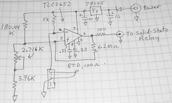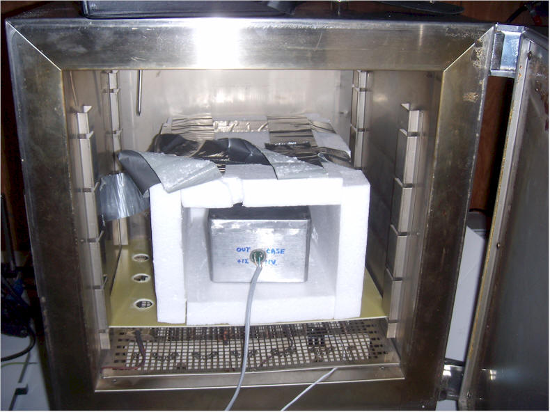 This simple bang-bang controller added to the temperature chamber holds a fraction of a degree inside the Styrofoam box shown below. The chamber's original control becomes an over-temperature safety switch.